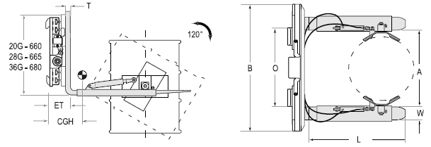 Capacity 承載能力(kg) | Catalog Order NO 型號(hào) | Mounting Class 安裝等級(jí) | Capacity Load Center on forks承載能力@貨叉載荷中心(kg@mm) | Frame Width 框架寬度B(mm) | Opening Range張臂范圍A(mm) | Fork Size貨叉尺寸LxWxT(mm) | Minimum Truck Carriage Width叉車貨叉架寬度最小值O(mm) | Weight 自重(kg) | Effective 失載距ET(mm) | Horizontal Center of Gravity 水平重心CGH(mm) |